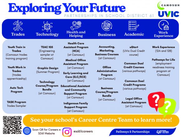 Dual credit courses and programs enable students to receive credit for post-secondary courses while simultaneously receiving high school credit towards their graduation. Both Camosun College and the University of Victoria provide SD61 students with the opportunity to take post-secondary courses, tuition-free, while they are still in high school.